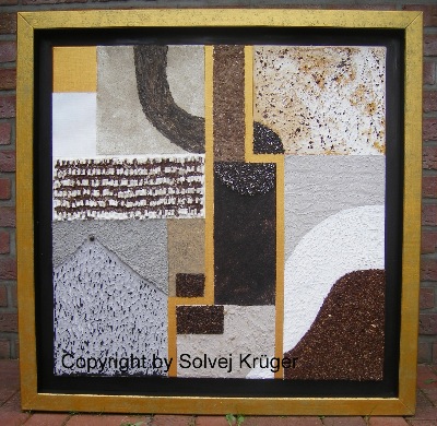 Bei meinen Strukturbildern handelt es sich im weitesten Sinne um Malerei.Das Finden von alltäglichen Naturmaterialien, die zu Pasten verarbeitet und in künstlerischen Prozessen in neue Zusammenhänge gestellt werden, machen die künstlerische Auseinandersetzung mit scheinbar Nutzlosem sehr reizvoll. Die konstruktive Strukturierung begreife ich als stetig geistige Auseinandersetzung mit Materialien, Farbe, Strukturen, Flächen und der Komposition.